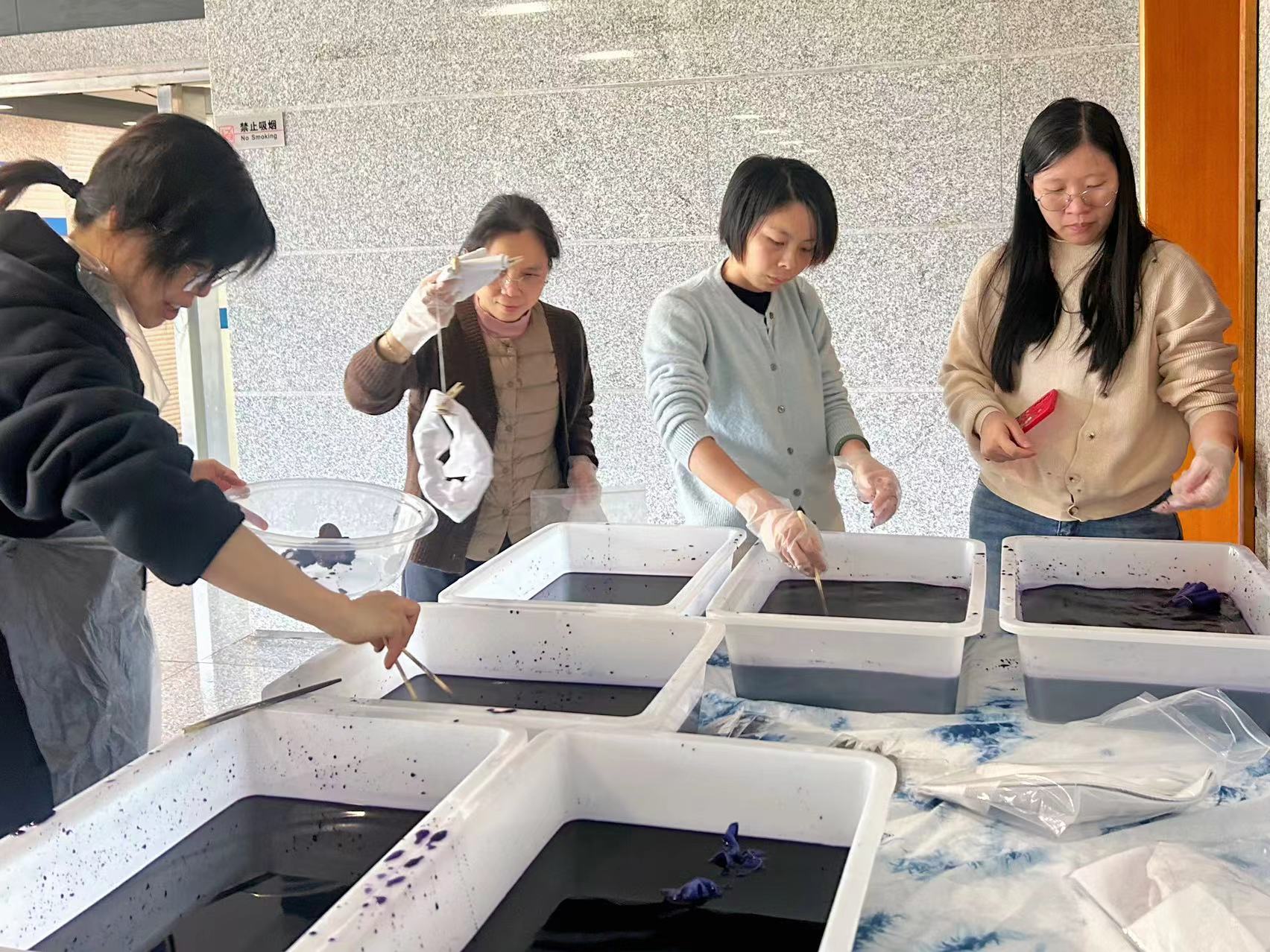 “巧手扎錦繡,靛藍(lán)染繁花”,扎染活動(dòng)進(jìn)入正題,大家先對(duì)扎染的歷史淵源、發(fā)展脈絡(luò)、制造技藝有了深入了解,并通過一系列風(fēng)格迥異的扎染藝術(shù)作品,激發(fā)了濃厚的創(chuàng)作熱情。隨后,大家通過夾扎法和捆扎法,發(fā)揮想象力和創(chuàng)造力,親自設(shè)計(jì)、結(jié)扎并染色,制作出獨(dú)具特色的扎染作品。