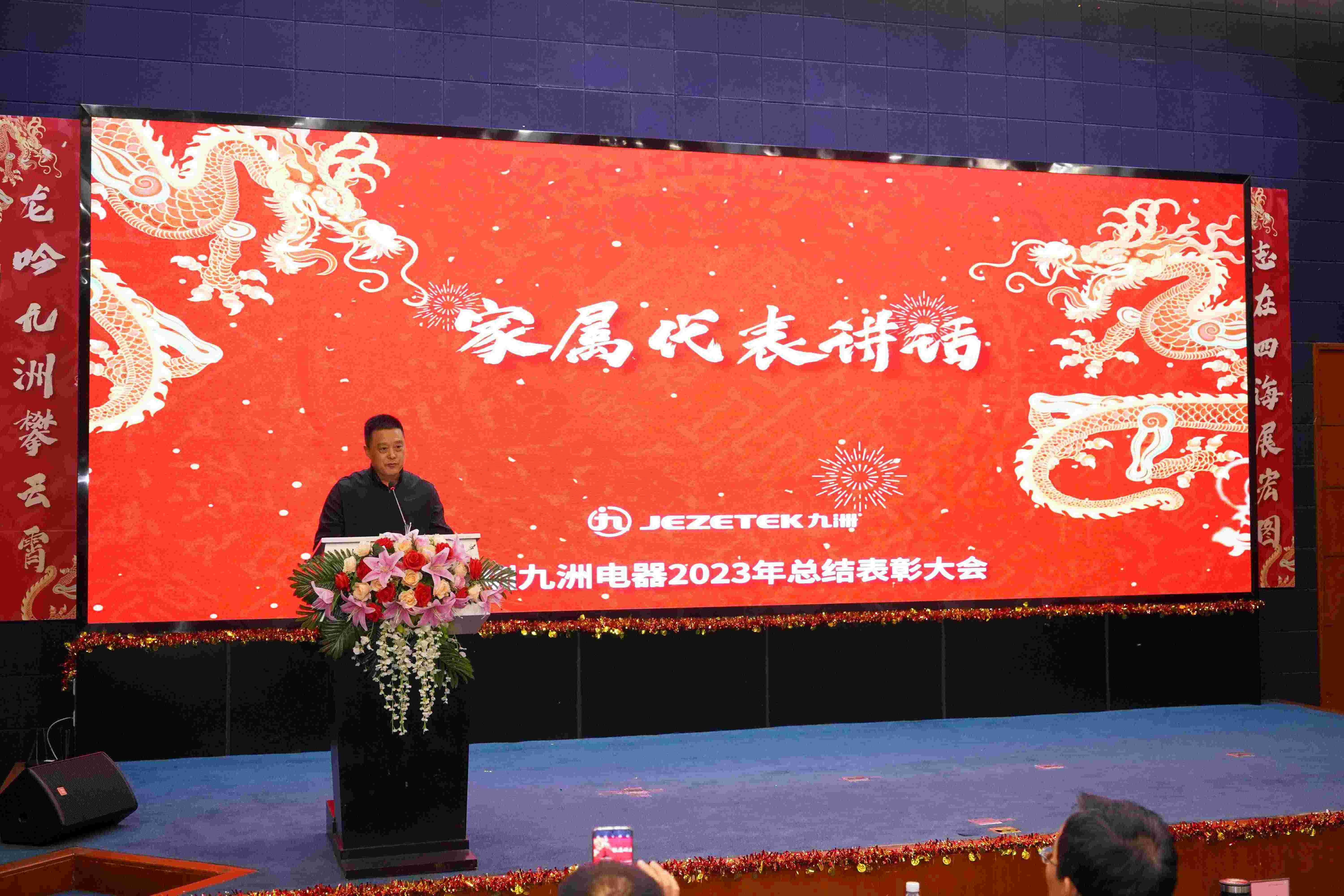 成績的取得離不開廣大員工的辛勤付出和集體智慧,更離不開九洲家屬們的默默奉獻,家企攜手同心,共筑美好未來,公司數(shù)字產(chǎn)品線副總經(jīng)理辛巍的父親作為家屬代表發(fā)言。他對公司給予辛巍發(fā)展平臺和機會表示感謝,對公司取得的驕人成績而自豪,表示將一如既往地支持工作,相信公司在領導的帶領下,在大家的共同努力下,將會取得更大的成績。